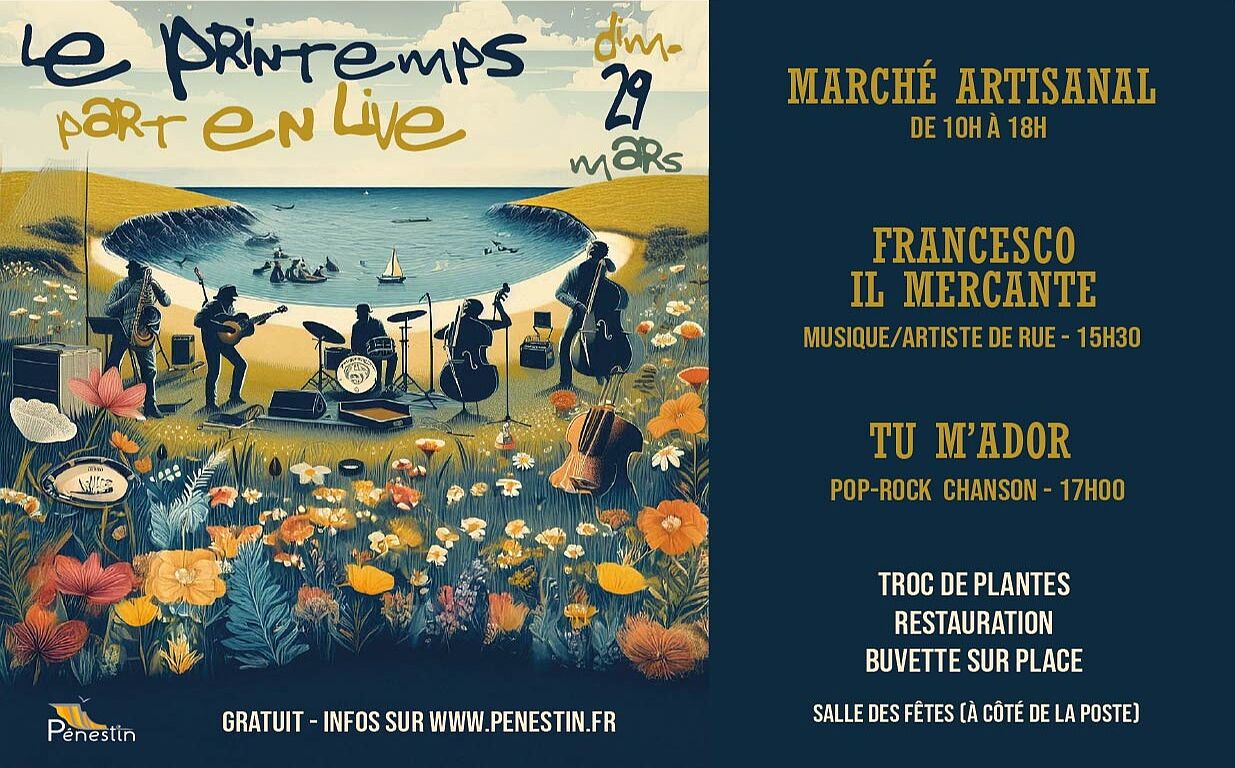 Le service culturel de la mairie de Pénestin organise le festival Le printemps part en live le dimanche 29 mars 2026. Cette manifestation propose un troc de plantes, un marché de créateurs et de producteurs locaux, concerts etc… Dans le cadre de son marché, nous recherchons des créateurs ou des producteurs locaux. Pour y participer, merci de nous envoyer un mail à animations@penestin.fr.