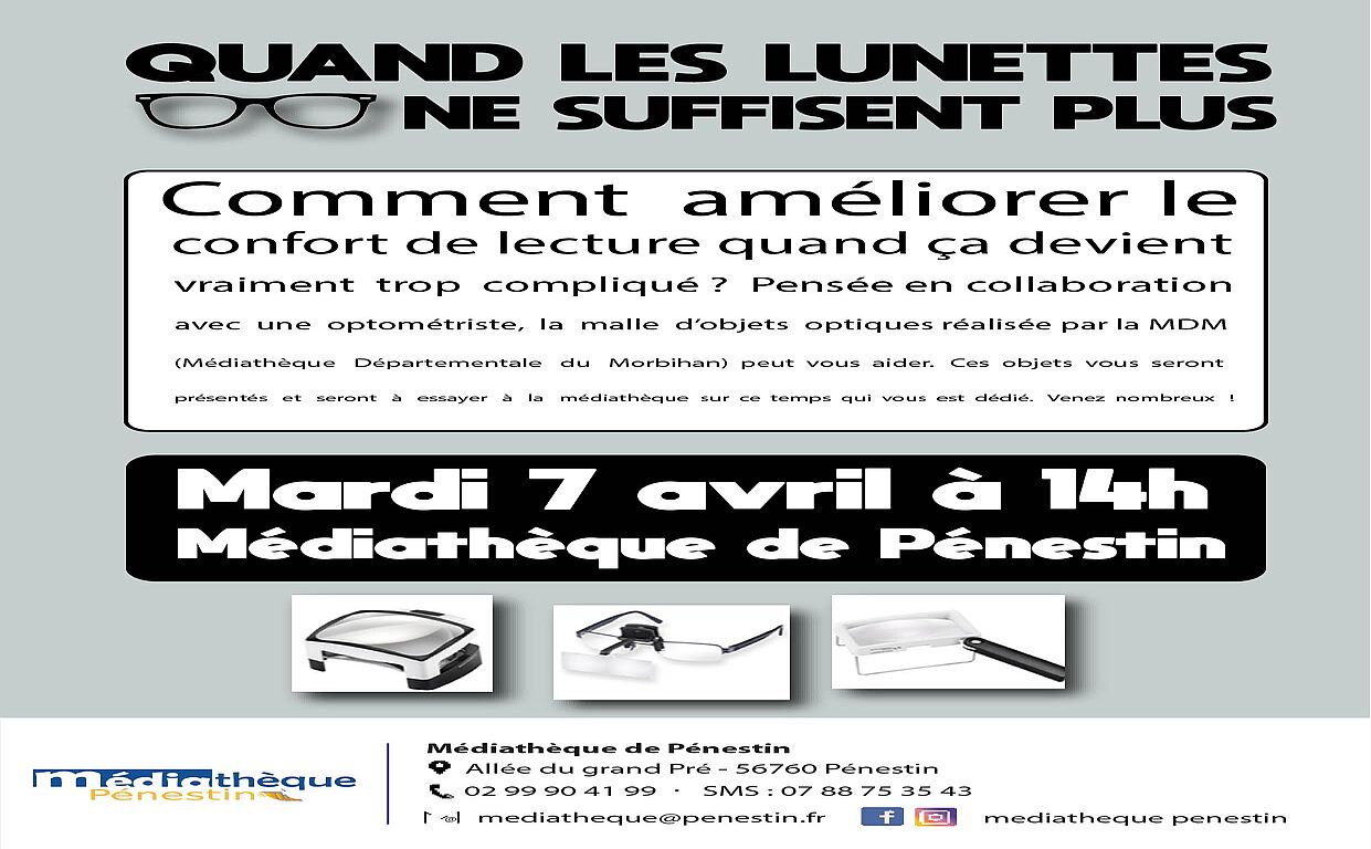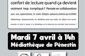 Comment améliorer le confort de lecture quand ça devient vraiment trop compliqué ? Pensée en collaboration avec une optométriste, la malle d'objets optiues réalisée par la Médiathèque Départementale du Morbihan peut vous aider. Ces objets vous seront présentés et seront à essayer à la médiathèque sur ce temps qui vous est dédié.